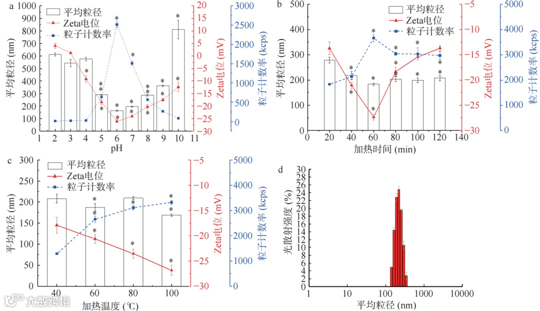 图4 pH、加热时间、加热温度对葛根蛋白纳米颗粒组装的影响