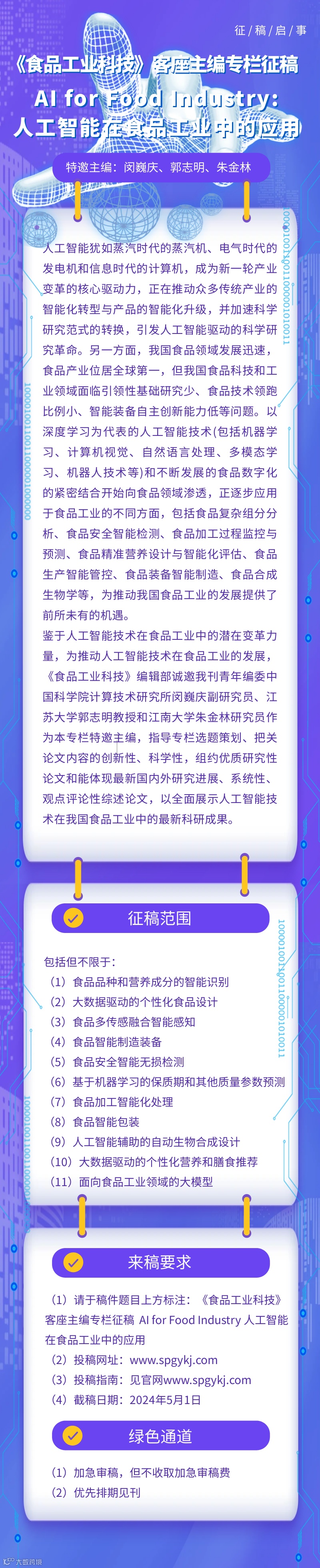 《食品工业科技》青年编委专栏征稿:AI for Food Industry:人工智能在食品工业中的应用 ☚