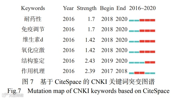 动物源活性肽的关键词主要形成了 11 个聚类,具有主题相似性的关键词被归一类。分析发现,抗菌肽(频次 543)和抗氧化肽(频次 153)引领了近年来动物源活性肽总体的研究方向,是国内学者研究的热点,出现频次较高的关键词有“作用机制”、“抗菌活性”、“生长性能”、“响应面”等。其中,聚类一以抗菌肽为主线研究其生物学活性、作用机制和应用等。大量研究表明,抗菌肽 Cathelicidins 可有效抑制细菌生物被膜形成和促进嗜中性粒细胞的免疫功能,在治疗抗耐药菌引起的严重感染中具有广阔的应用前景,在基础研究方面主要研究的是生物学特征和作用机制之间的相关性。聚类二以抗氧化肽为主线,研究其酶解、纯化等工艺条件筛选和生物学功能评价。胡晓等采用响应面分析法对酶法水解罗非鱼皮制备抗氧化肽的工艺条件进行优化,发现最优酶解条件优化后罗非鱼皮蛋白抗氧化活性肽的还原力较优化前确有提高。图 7 是关键词突变图谱,Key- words 表示节点类型,Year 表示节点出现的时间, Strength 代表突现强度,Begin 代表突现开始时间, End 代表突现结束的时间,蓝色线条代表未突现时间段,红色线条代表突现时间段。突现词不仅能反映某个领域内研究的热点,更能反映出该领域的热点趋势,有些频次低的关键词有可能反映学科研究领域的前沿动态,频次较低的关键词如耐药性(8 次)、维生素 D(5 次)、氧化应激(7 次)、免疫调节(9 次)等,这些关键词虽然出现频次较低,但是近几年突现较为强烈,且数量较多,是现在和未来研究的热点。