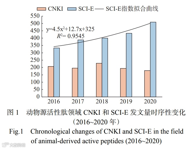 通过分析文献发表的时间分布规律,有助于确定文献随时间变化的关系,可总体展示研究领域发展的某些特点和规律。如图 1 所示,在 2016~2020 年间,CNKI 数据库共发表中文核心期刊文献 1005 篇,每年发文量均维持在 180 篇左右;SCI-E 数据库共发表英文文献 2063 篇,近五年来呈现稳定增长趋势,通过指数拟合增长曲线可知,动物源活性肽领域的研究将持续发展,预测 2021 年该领域 SCI-E 文献数将超过 550 篇。近五年,CNKI 的发文量总体保持相对稳定状态,但是在 2019 和 2020 年均出现了小幅度下降,主要原因在于国内学者在该领域的研究水平和研究质量逐年提升,相关成果更多地选择在英文期刊进行投稿和发表。
