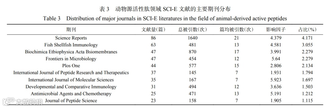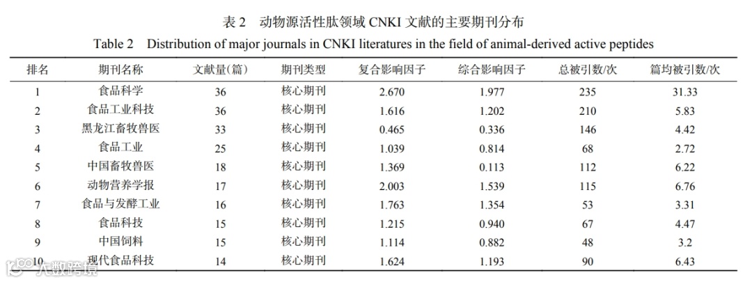 对近五年动物源活性肽领域的发文期刊进行统计分析,综合发文量、期刊类型、复合影响因子、综合影响因子,选取了影响力排名前 10 的期刊,结果如表 2 所示。从表 2 中分析得出,动物源活性肽领域的文献大多都发表在核心期刊上。综合排名第一的期刊是《食品科学》,文献量 36 篇,复合影响因子 2.670,综合影响因子 1.977,总被引数和篇均被引数远高于其他期刊;该期刊内容丰富,实用性强,信息量大,目前已被美国《工程索引》(EI Compendex)、美国《化学文摘》(Chemical Abstracts,CA)、中国科学引文数据库(CSCD)、等国际国内检索系统收录,多次在食品工业类期刊排名第一。综合排名第二的期刊是《食品工业科技》,文献量 36 篇,复合影响因子 1.616, 综合影响因子 1.202, 期刊的影响力指数(CI 值)在全国“食品科学技术”51 种期刊中排名第 2,位于 Q1 区(2020 年),目前该刊入选中国科技核心期刊、中国精品科技期刊,RCCSE 排名提升至 A 类第一名,并且连续 9 届入选北大核心,是食品领域的优质期刊。