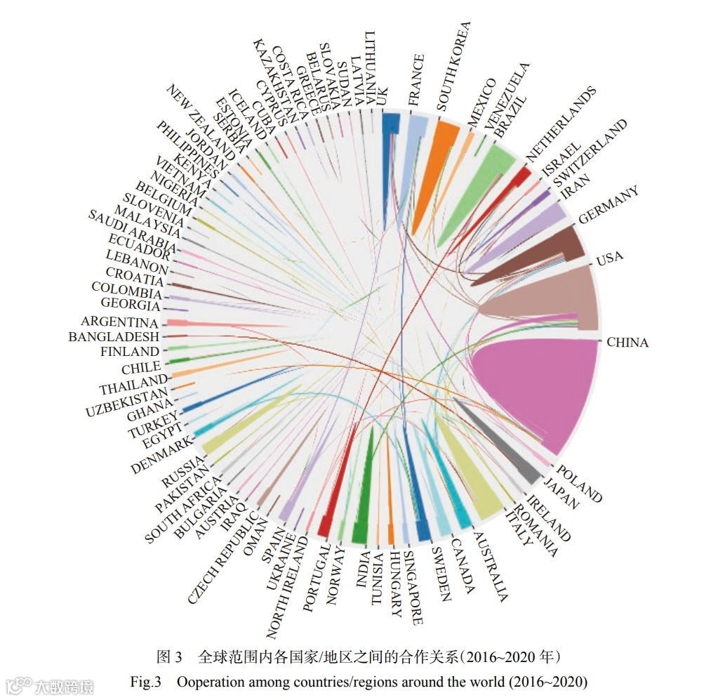 图 3 展示了 2016~2020 年期间全球动物源活性肽研究国家/地区合作关系。近五年,该研究领域发表 SCI-E 论文的国家/地区有 84 个,由图 3 可知,世界各个国家/地区间开展密切的合作研究,跨区域合作频繁,尤其中、美、德、印国等国家均表现出较大的研究体量和合作关系,其中中国与美国、德国、英国等国家的合作关系较为密切。