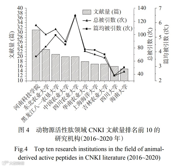 通过分析研究机构的分布情况,能够帮助了解学术界对该研究领域的支持与认可程度,有利于该领域的和谐发展和相关机构之间的合作与交流。图 4 是 2016~2020 年动物源活性肽研究领域 CNKI 主要研究机构(前 10)文献分布及分析指标,主要从文献量(篇)、总被引数(次)和篇均被引数(次)三个指标来分析研究。从图 4 中发表文献量排名来看,论文发表最多的研究机构是河南科技学院,该院校的生物学等相关学科是省级重点一级学科,该机构主要研究了抗菌肽对肉鸡养殖、养猪、临床上的应用;对牛血红蛋白源抗菌肽 P3 及其类似肽、鸡抗菌肽 NK-lysin 抗菌肽 JH-3 的抗菌谱、溶血性等生物信息学进行了分析,研究了抗菌肽对肠道菌群的影响。河南科技学院的总被引数和篇均被引数也相对较高,说明河南科技学院发表的文献质量较高。其次是东北农业大学,发文量 23 篇,总被引数 100 次,篇均被引数 4.35 次。文献量排名第五的四川农业大学,发文量虽然相对较低,但是其总被引数和篇均被引数是国内发文机构最高的,分别是 129和 6.45 次。