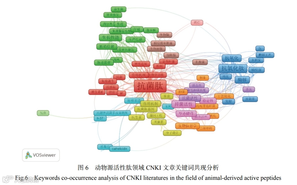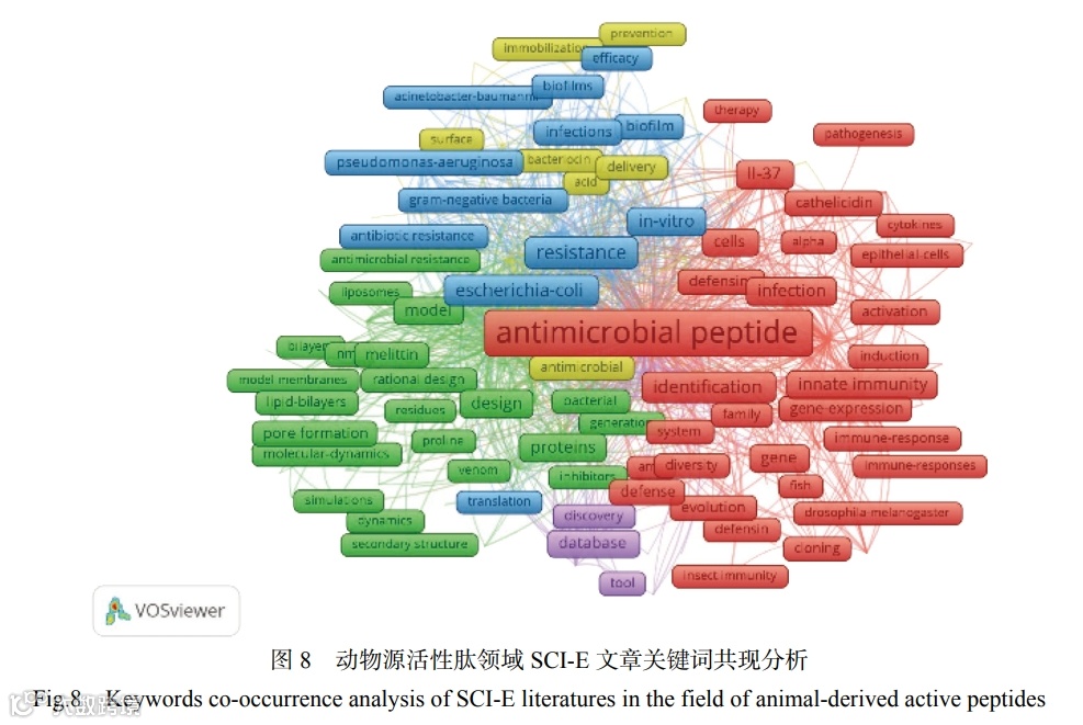 应用 VOSviewer 对近五年 SCI-E 研究论文的关键词共现情况进行分析(图 8),五年累计有 8778 个高频关键词形成共现网络,设定关键词出现的最小次数为 15 次,对含义相同写法不同的关键词进行合并、替换,有 210 个高频关键词达到阈值, 其中 20 个关键词的词频超100 次,反映了学术共同体的普遍关切及研究总体趋势。关键词出现的频次越高,表明该研究成果越多,研究内容越集中,可以反映该领域的研究热点。动物源活性肽领域的文章关键词主要对抗菌肽的研究,研究其基因、鉴定方法、细胞因子等。第二大聚类主要研究了动物源活性肽的序列、分离方法等。关键词出现频次最高的是抗菌肽( 935 次), 其次是机理(387 次)、抵抗力(199 次),这也在一定程度上代表了动物源活性肽领域的研究热点与研究方向。由于影响动物源活性肽结构、生物和功能特性的因素有多种,如抗高血压、抗氧化、降胆固醇、保水性、起泡性、乳化性和溶解性,因此学者们从多角度研究活性肽的结构和特性,通过研究活性肽复杂的作用机理,可以对肽活性做出科学评价。