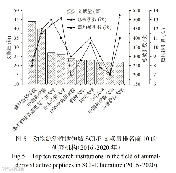 通过分析近五年 SCI-E数据库中动物源活性肽研究机构的发文量和被引频次分析, 列举了影响力排名前 10 的研究机构如图 5 所示。由图 5 可知,排名第一的研究机构是俄罗斯科学院,其文献量 44 篇,总被引数 277 次,篇均被引数 8 次;排名第二的是中国科学院,其文献量40 篇,总被引数 423 次,篇均被引数 12 次,总被引数和篇均被引数均高于俄罗斯科学院。在世界排名前十的 SCI-E 研究机构中,中国的研究机构就有 5 个,四川大学和兰州大学排名第七和第八,由此可见,俄罗斯科学院和中国的研究机构是动物源活性肽领域研究的主力军,在国际上有着举足轻重的作用。综合图 5 分析,发文数量和总被引数突出的都是世界传统名校或研究院,最典型的国家有俄罗斯和中国,俄罗斯以俄罗斯科学院发表论文多而突出,而中国的中国科学院虽然在论文发表数量上略低于俄罗斯科学院,却在总被引数方面特别突出。