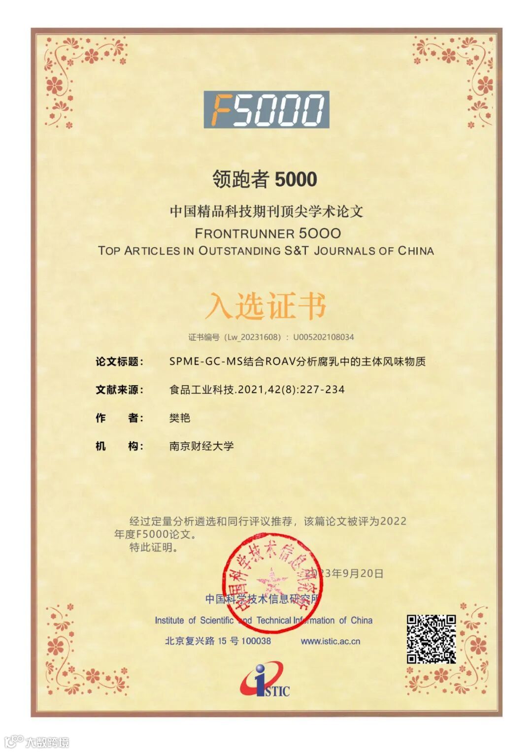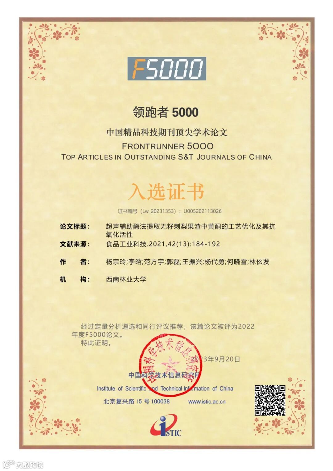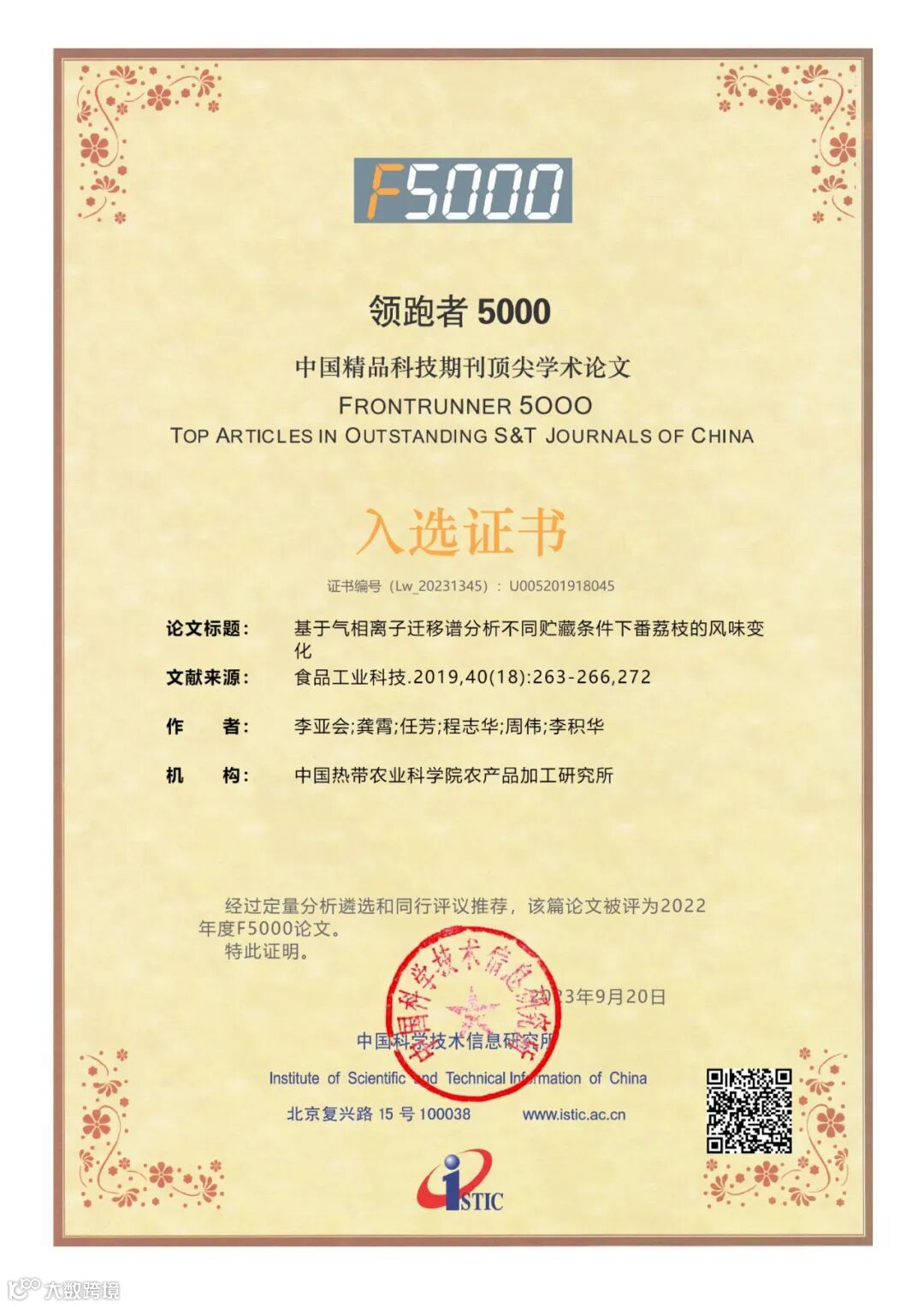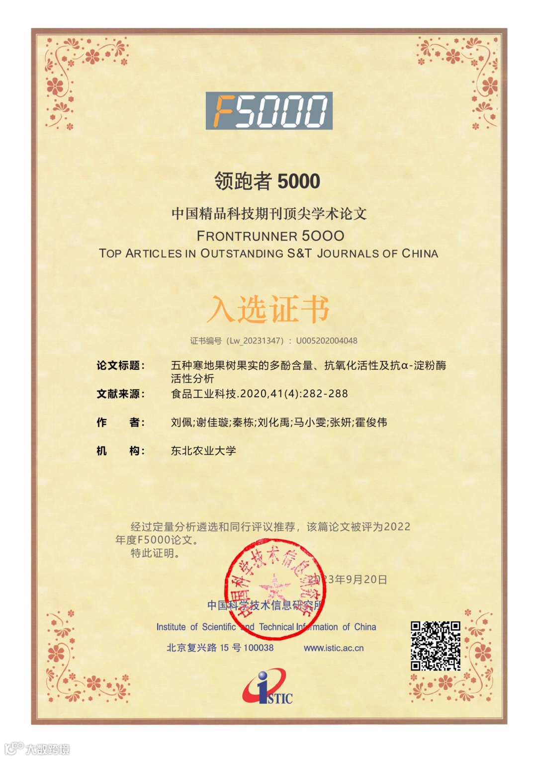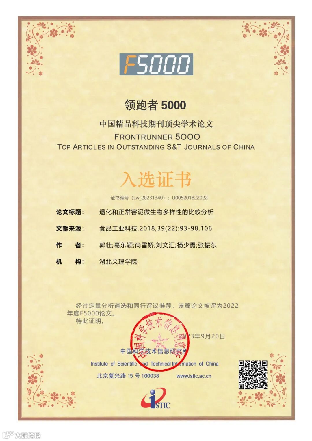 2023年9月20日,我国权威科技信息研究机构——中国科学技术信息研究所在其主办的2023年“中国科技论文统计结果发布会——暨中国一流科技论文世界影响力评价论坛会议”期间颁布了“2022年度中国精品科技期刊顶尖学术论文(F5000)”获奖证书。“领跑者5000——中国精品科技期刊顶尖学术论文平台(简称F5000)”是由国家科技部主导,中国科学技术信息研究所建设,旨在推动我国科技期刊发展,向国内外展示和交流我国优秀学术论文,以扩大期刊和作者的学术影响力,引领我国高水平科技期刊事业的发展和成长。该项目通过定量分析遴选和同行推荐相结合的方式,从中国精品科技期刊中择优选取各学科前1%高被引论文。