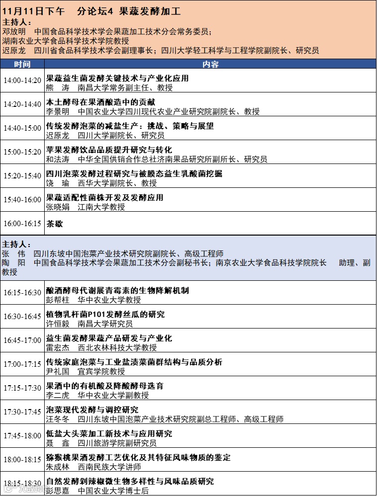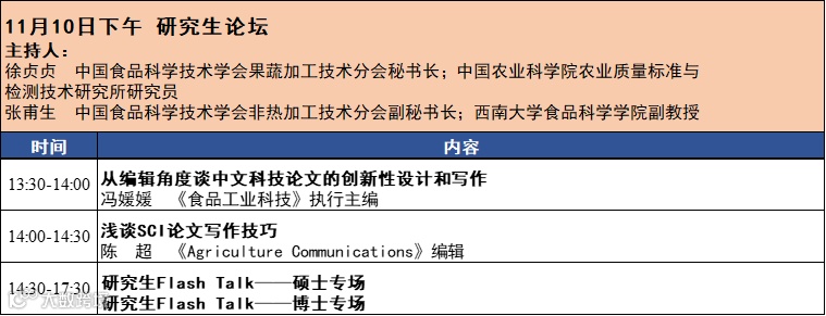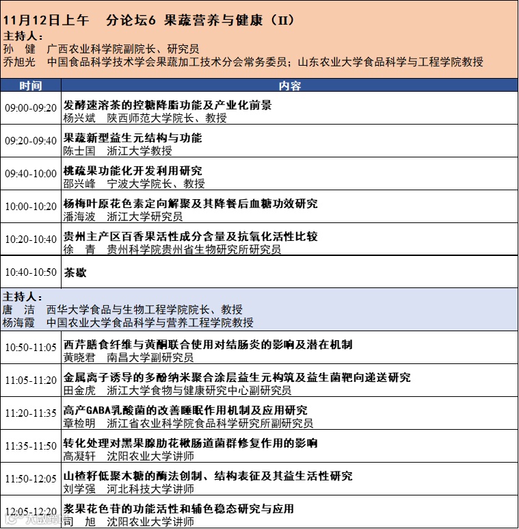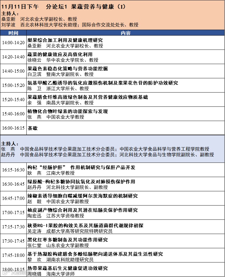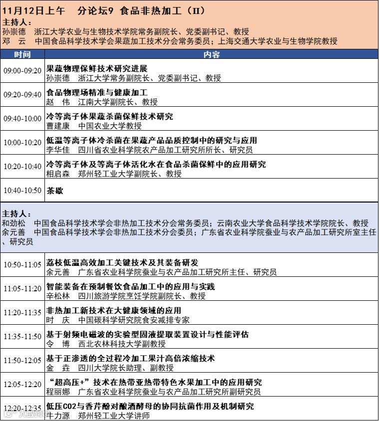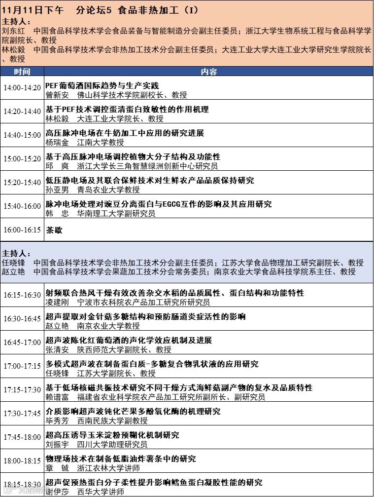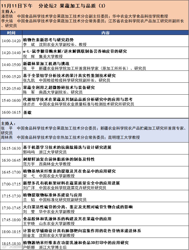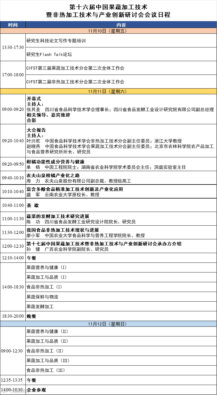 第十六届中国果蔬加工技术暨非热加工技术与产业创新研讨会将于2023年11月10-12日在四川成都召开。本次会议由中国食品科学技术学会果蔬加工技术分会、中国食品科学技术学会非热加工技术分会和四川省食品科学技术学会主办。会议热诚欢迎相关领域的专家学者和企业代表齐聚成都。会议完整日程发布如下: