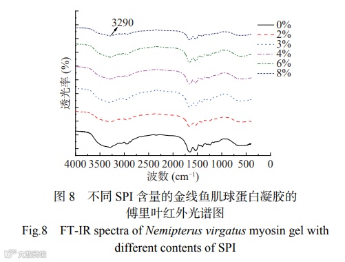 红外光谱图中酰胺A振动波段(3500~3250 cm−1)与O-H振动伸缩有关,其吸收峰的变化主要受氢键的影响;酰胺Ⅰ带(1600~1700 cm−1)常与酰胺Ⅲ带(1220~1330 cm−1)结合分析蛋白质的二级结构。由图8可知,在3290 cm−1附近有一个较为明显的吸收峰,这是由蛋白质羟基和 N-H 的伸缩振动引起的,添加0%、2%、3%、4%、6%、8% SPI时该峰的波数分别为3293.453、3292.488、3291.524、3291.524、3290.560和3291.524 cm−1。与对照组相比,随着SPI添加量的增加,实验组该峰值对应的波数发生不同程度的降低,表明混合凝胶中氢键增强,与图7结果一致,而增强的氢键是混合蛋白凝胶强度增加的原因之一。添加SPI前后的峰位和峰形基本相同,说明添加SPI没有改变金线鱼肌球蛋白的功能性基团,也没有新的功能性基团生成。