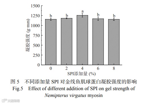 由图5可知,在8%的SPI添加量范围内,金线鱼肌球蛋白凝胶强度随着SPI添加量的增加呈现出先上升后下降的趋势,添加4% SPI组样品的凝胶强度最高(1255.253 g·mm),与对照组(1155.161 g·mm)相比,凝胶强度增加了8.66%。表明适量的SPI能显著提高金线鱼肌球蛋白凝胶强度,原因可能是SPI的填充效应使金线鱼肌球蛋白凝胶的网状结构更加紧密,而过多的SPI对金线鱼肌球蛋白的稀释效应或添加过量的SPI可能会阻碍金线鱼肌球蛋白的交联导致混合蛋白整体的凝胶性下降。邓立青等研究发现添加3%的SPI时铜盘鱼鱼糜的凝胶强度最好、崔旭海等研究发现添加适量的外源性蛋白可以提高鲤鱼鱼糜的凝胶强度,和本文的研究结果相似。此外,凝胶强度的变化趋势和图2总巯基含量的变化趋势一致,证实了巯基氧化形成二硫键有利于凝胶特性的改善。