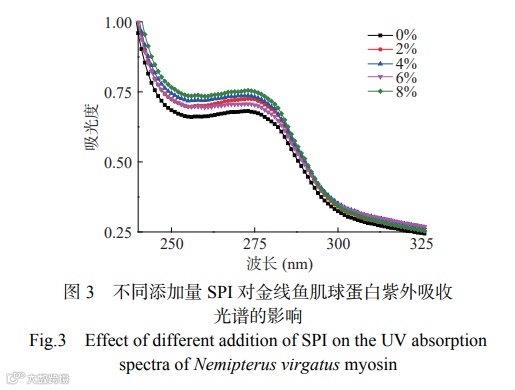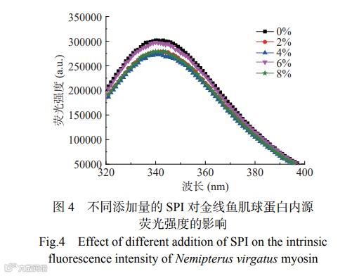 内源荧光强度通常用于通过估计受荧光能量影响的芳香族氨基酸残基(主要是色氨酸)的变化来确定蛋白三级结构的变化。由图4可知,添加SPI后,混合溶液的荧光强度均低于对照组,出现荧光猝灭现象。表明SPI与金线鱼肌球蛋白的混合使金线鱼肌球蛋白三级结构发生变化,位于蛋白质内部的芳香族氨基酸分子的侧链基团暴露,金线鱼肌球蛋白分子中色氨酸或酪氨酸残基的微环境发生了改变。此外,随着SPI添加量的增加,混合溶液的荧光强度呈现先下降后上升最后下降的趋势,4% SPI组的内源荧光强度最低,表明4%的SPI与金线鱼肌球蛋白相互作用时,更接近于位于蛋白疏水空腔内自发荧光的氨基酸残基。SPI添加量低于4%时荧光猝灭的主要原因可能是适量的SPI诱导金线鱼肌球蛋白结构展开,暴露出更多的内部芳香族氨基酸残基;6%的SPI添加量时荧光强度的上升可能是由于形成了高分子量聚合物,导致一些非极性芳香氨基酸残基被掩盖;8%的SPI添加量时荧光强度再次下降的原因可能是添加过量的SPI本身所含有的芳香族氨基酸残基的暴露和金线鱼肌球蛋白暴露出的芳香族氨基酸残基共同作用的结果。荧光光谱(图4)与紫外光谱(图3)的结果一致,均证明了SPI的添加使金线鱼肌球蛋白三级结构发生改变,进而影响氨基酸残基的微环境。