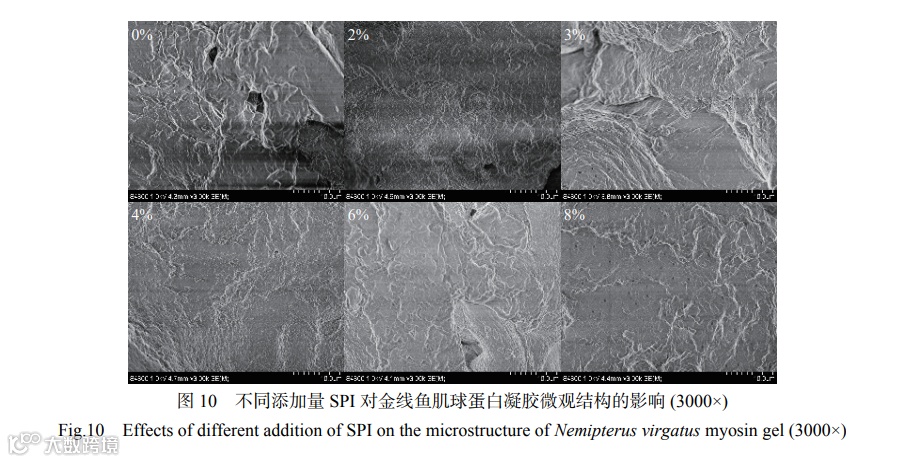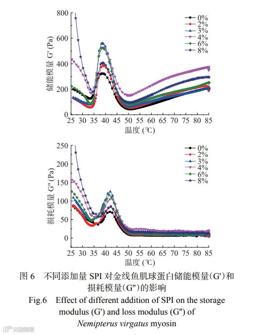 储能模量(G')表示样品的弹性趋势,损耗模量(G'')表示样品的粘性趋势。如图6所示,对照组的G'在38.65 ℃时达到峰值323.952 Pa,表明金线鱼肌球蛋白头部变性形成弹性凝胶网络,50.90 ℃之后随着温度的升高G'缓慢增加,添加SPI组样品的G'变化趋势与对照组基本一致。G''与G'的变化趋势相似,加热过程中,G'值大于G''值,表明金线鱼肌球蛋白形成了弹性凝胶。随着SPI添加量的增加,G'值与G''值都呈先增加后减少最后增加的趋势,且都高于对照组,这可能是由于加热增强了SPI与金线鱼肌球蛋白的变性和交联,形成了高弹性的凝胶网络结构。0%~4%的SPI的添加能结合自由水,填充金线鱼肌球蛋白凝胶网络,从而强化了金线鱼肌球蛋白凝胶基质,使蛋白分子间的相互作用增强;4%添加量之后,G'值与G''值下降的原因可能是过量SPI的添加阻碍了金线鱼肌球蛋白的交联,而8% SPI添加量时金线鱼肌球蛋白的G'与G''值再次上升的原因可能是过量的SPI加热后本身所具有的粘弹性对金线鱼肌球蛋白凝胶基质的强化作用大于SPI对金线鱼肌球蛋白的稀释作用。综上,添加4% SPI组样品的G'值与G''值最大,表明添加4% SPI时金线鱼肌球蛋白凝胶的粘弹性最好,此结果和凝胶强度、质构特性的结果一致。