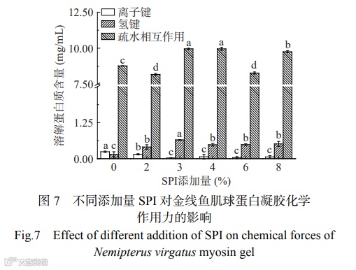 由图7可知,疏水相互作用是维持蛋白构象稳定的主要作用力,离子键占比最小。蛋白质受热变性,离子键断裂、疏水基团暴露,相邻蛋白分子之间疏水部分的结合可以降低凝胶体系熵值,促进蛋白间相互作用,从而增强凝胶强度。氢键主要维持蛋白质的二级结构,它是转变β-折叠的主要驱动力。随着SPI添加量的增加,疏水相互作用呈现出先下降后上升再下将最后上升的趋势,氢键含量呈现出先增加后减少的趋势,离子键含量呈现出先减少后略微增大的趋势。添加SPI后离子键含量减小可能是由于SPI阻止了蛋白质之间和金线鱼肌球蛋白内部离子键的形成,使金线鱼肌球蛋白分散,当加入过多的SPI时,pH值的差异可能会改变氨基酸的电荷分布位点,导致离子键略有增加;氢键含量增加可能是由于添加的SPI与自由水结合,导致总体蛋白与水分子间的作用增强,氢键增加,而3% SPI添加量之后氢键又减少可能是由于过量的SPI与金线鱼肌球蛋白竞争水分子,使蛋白质与水分子间的作用减弱,氢键减少;添加2%和6% SPI时疏水相互作用下降可能是由于SPI吸水后粘度变大,限制了部分蛋白质分子的伸展和分子内部疏水基团的暴露以及6%时过量的SPI对暴露出来的疏水基团的再次埋藏作用,3%~4%适量的SPI的添加促进了金线鱼肌球蛋白分子内部疏水基团的暴露,和巯基变化规律相似,而8%较多过量的SPI添加由于SPI自身可形成凝胶网络,可显著增加疏水相互作用。在0%~8%的SPI添加量范围内,3% SPI添加量时氢键值最大、离子键值最小,4% SPI添加量时疏水相互作用值最大,表明3%~4%的SPI添加量范围内金线鱼肌球蛋白凝胶的化学作用力最有利于蛋白构象的稳定,从而利于金线鱼肌球蛋白凝胶特性的改善,与前面的试验结果一致。