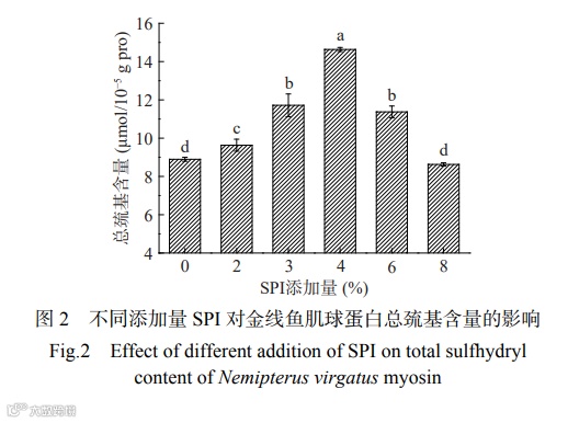 粒径是蛋白质聚集体大小的宏观表现。当蛋白质发生变性、聚集时,粒径就会增大。如图1所示,所有试验组的粒径均高于对照组,并且随着SPI添加量的增加粒径逐渐变大。这是因为SPI与金线鱼肌球蛋白发生相互作用,诱导金线鱼肌球蛋白结构发生变化,暴露出更多的疏水基团,蛋白分子通过疏水相互作用、静电相互作用等聚集成簇,使粒径增大。Niu等发现SPI和和肌肉蛋白之间主要通过疏水相互作用、氢键和二硫键产生相互作用,且经过温和加热结合酸处理后的SPI与肌肉蛋白间产生了更强的相互作用。在2%~4%的添加量范围内,粒径增量较大,添加量超过4%以后,粒径增量变小,表明4%添加量时,SPI、金线鱼肌球蛋白间的结合近似饱和。