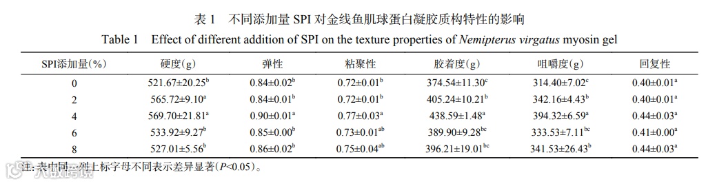 如表1所示,0%~4%的SPI添加量范围内,金线鱼肌球蛋白凝胶的硬度随着SPI添加量的增加而逐渐上升,4% SPI添加量时硬度达到最大值569.70 g,之后逐渐下降。与对照组相比,弹性、粘聚性、胶着度、咀嚼度和回复性都呈现出先上升后下降最后略微上升的趋势,于4% SPI添加量时达到最大值。4% SPI添加量之前,质构特性改善的原因可能是SPI对金线鱼肌球蛋白凝胶网络的填充作用和其本身作为内源酶抑制剂能够抑制霉变、改善质构的作用;4% SPI添加量之后,质构特性下降的原因可能是过量SPI的添加对金线鱼肌球蛋白产生了较强的稀释作用、阻碍了金线鱼肌球蛋白的交联,而8% SPI添加量时金线鱼肌球蛋白凝胶的质构特性又略微得到改善的原因可能是过量的SPI对水分的吸收和加热后形成的SPI聚集体对金线鱼肌球蛋白凝胶基质的强化效应大于SPI对金线鱼肌球蛋白的稀释作用。综上,SPI添加量为4%时,金线鱼肌球蛋白凝胶的质构特性最好,与凝胶强度的结果一致。