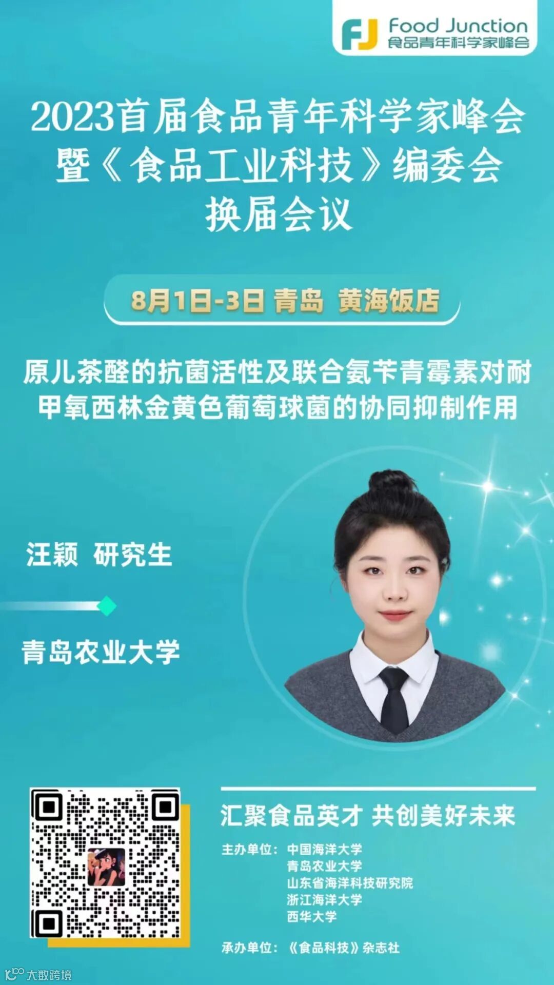 汪颖,女,青岛农业大学食品科学与工程专业硕士研究生,研究方向是天然活性抑菌物质对食源性病原微生物的抑制作用及机理研究。授权国家发明专利一项,参与海峡两岸暨港澳健康食品论坛研究生分论坛获得一等奖。多次获得优秀学生奖学金。