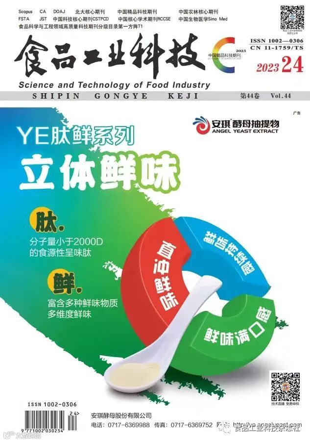 《食品工业科技》是《食品科学与工程领域高质量科技期刊分级目录》第一方阵T1,目前已被荷兰《文摘与引文数据库》Scopus、美国《化学文摘》CA、瑞典开放存取期刊目录DOAJ、美国EBSCO数据库、英国《食品科技文摘》FSTA、日本科学技术振兴机构数据库JST、世界期刊影响力指数(WJCI)报告、北大核心期刊、中国科技核心期刊CSTPCD、中国核心学术期刊RCCSE、中国农林核心期刊A、中国生物医学文献服务系统Sino Med、中国科技论文在线、中国知网、万方数据、重庆维普、超星、博看等国际、国内重要检索系统或数据库收录。