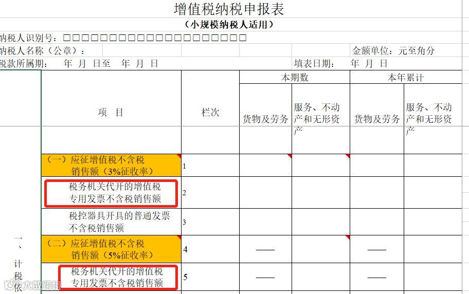 在填写增值税纳税申报表时,应当将当期开具增值税专用发票的销售额,按照3%和5%的征收率,分别填写在《增值税纳税申报表》(小规模纳税人适用)第2栏和第5栏“税务机关代开的增值税专用发票不含税销售额”的“本期数”相应栏次中