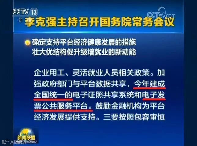 会议指出,“加强政府部门与平台数据共享,今年建成全国统一的电子证照共享系统和电子发票公共服务平台。”
