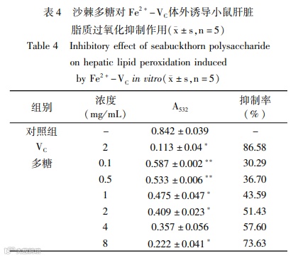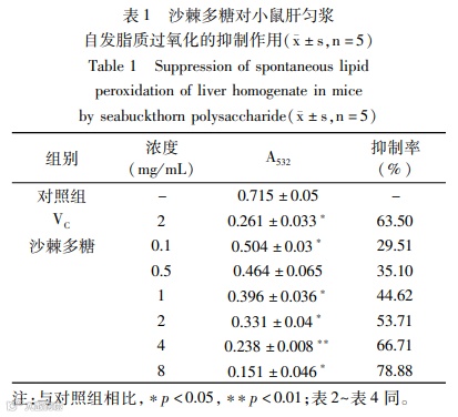 结论:沙棘多糖对DPPH自由基、OH·自由基和O2-·自由基都具有一定的清除能力,沙棘多糖对DPPH自由基、OH·自由基清除能力比较强,对O2-自由基清除能力较弱。当沙棘多糖在浓度为2 mg/mL时,还原能力稍高于同浓度VC。表明沙棘多糖具有良好的抗氧化活性。通过建立4种肝匀浆体外模型来模拟人体内环境,以VC为阳性对照与沙棘多糖组进行对比,沙棘多糖与VC均能抑制小鼠肝匀浆脂质过氧化物的生成。表明沙棘多糖拥有抗脂质过氧化的功用。