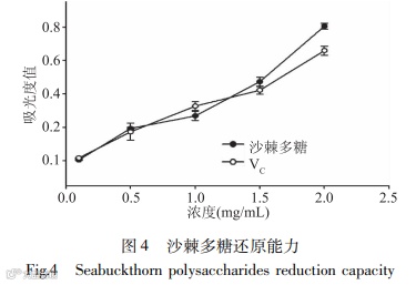 Conclusion: Seabuckthorn polysaccharide has certain scavenging ability on DPPH free radical, OH · free radical and O2-· free radical. Seabuckthorn polysaccharide has strong scavenging ability on DPPH free radical and OH · free radical, and weak scavenging ability on O2-· free radical. When the concentration of sea buckthorn polysaccharide was 2 mg / mL, the reduction ability was slightly higher than that of VC at the same concentration. It shows that seabuckthorn polysaccharide has good antioxidant activity. Four kinds of liver homogenate in vitro models were established to simulate the human body environment. VC was used as a positive control to compare with the seabuckthorn polysaccharide group. Both seabuckthorn polysaccharide and VC could inhibit the formation of lipid peroxides in mouse liver homogenate. It shows that seabuckthorn polysaccharide has the function of anti-lipid peroxidation.