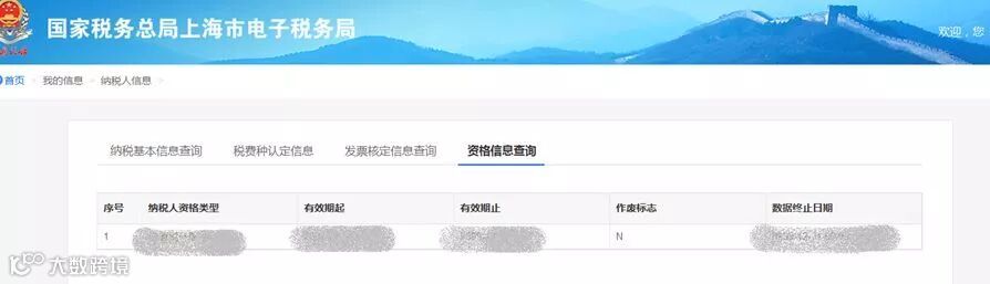 4.【资格信息】内容为纳税人资格认定信息,包括纳税人资格类型、有效期起止、作废标志和数据终止日期等,界面如下图所示:
