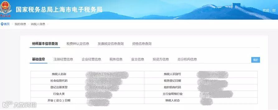 (1)基础信息内容为纳税人名称、纳税人识别号(统一社会信用代码)、税务登记日期、登记注册类型、组织机构代码、行业大类、主行业明细行业、开业(设立)日期、纳税人状态信息,界面如下图所示: