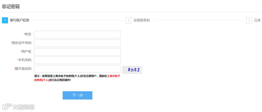 点击登录框中的【忘记密码】,进入找回密码界面,录入相应信息并验证后,完成密码重置。重置密码界面如下图所示: