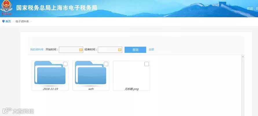 电子资料,为纳税人提供已提交的电子资料查询功能,可根据开始时间和结束时间查询电子档案,界面如下图所示: