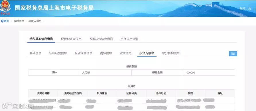 (6)投资方信息内容主要为投资总额、投资方名称、投资方经济性质、投资比例、证件种类、证件号码、国籍、地址,界面如下图所示: