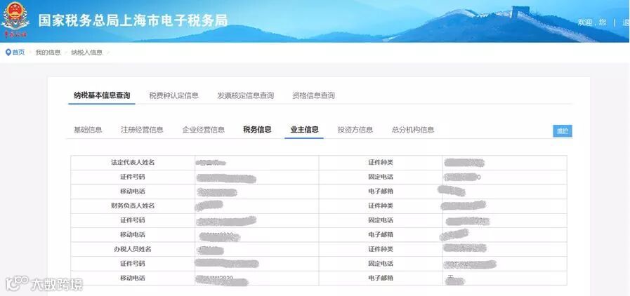 (5)业主信息内容主要为法人姓名、身份证件号、固定电话、邮箱、财务负责人姓名、身份证件号、固定电话、邮箱、办税人员姓名、身份证件号、固定电话、邮箱等个人信息,界面如下图所示: