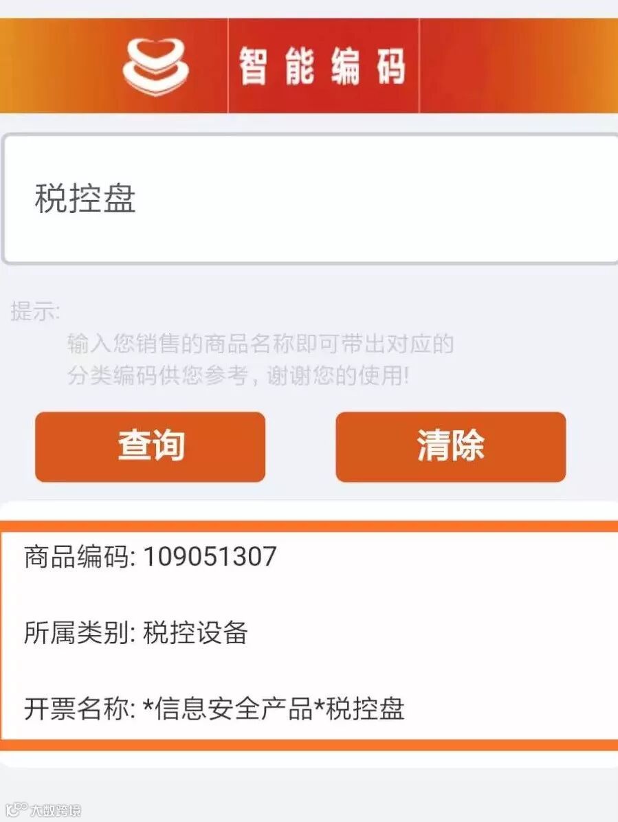 例如:搜索税控盘,显示对应商品编码、所属类别及开票名称,即编码推荐位置,对应税收分类编码简称,可参考选择是否使用。