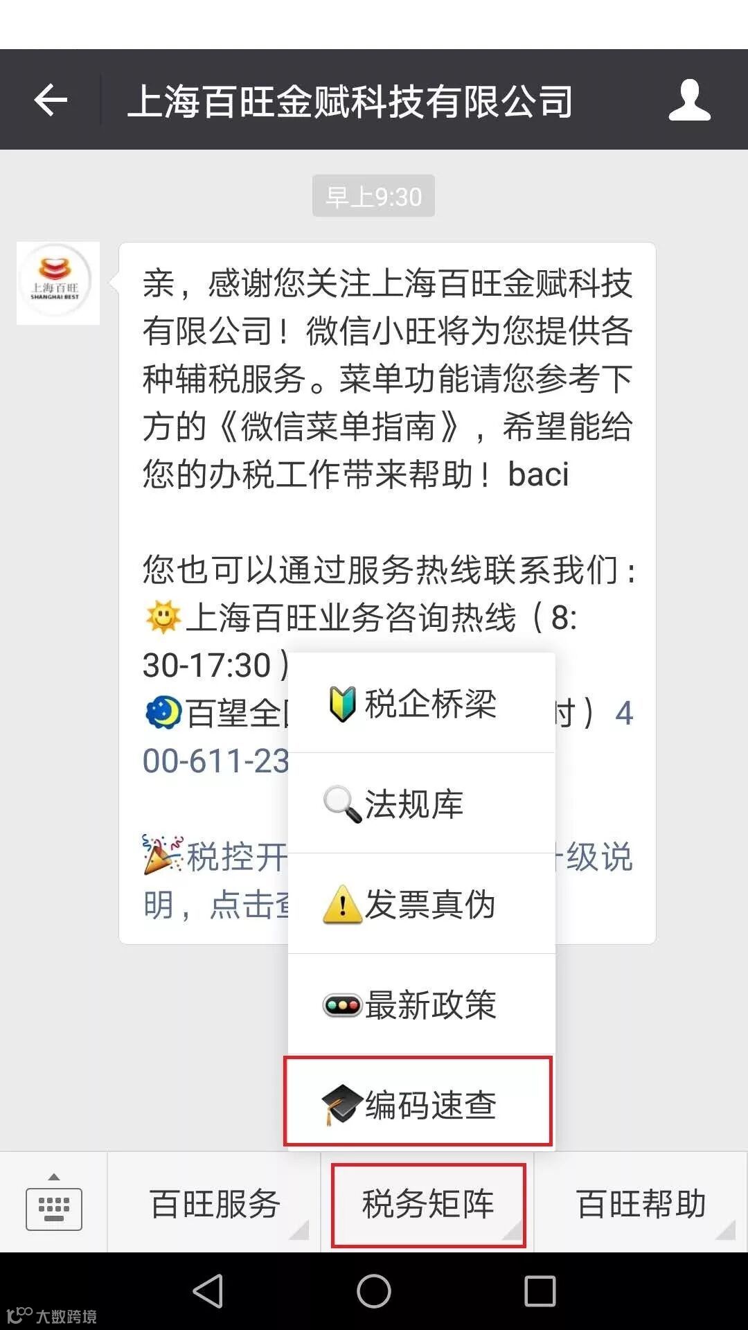 一、进入上海百旺微信公众号,点击底部菜单【税务矩阵】-【编码速查】