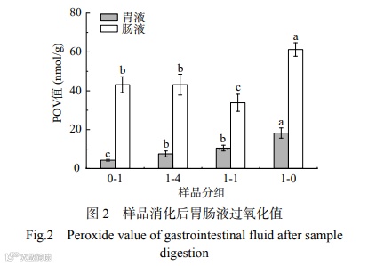 由于强酸、酶、胆盐、盐离子等作用,脂质在胃肠道内消化过程中易发生氧化反应,其生成的初级和次级代谢产物会被人体吸收进而在体内积累,损害正常细胞和功能,危害人体健康。过氧化值(POV)可表示初级氧化产物,丙二醛(MDA)则是次级氧化产物,两者共同检测可更全面说明脂质在模拟消化过程中的氧化反应。