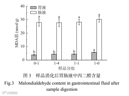 由图 2、图 3 可知,1:1 复配米和 1:4 复配米组胃液中的 POV 值和 MDA 含量均显著低于高粱组(P<0.05),肠液中的 POV 值显著低于高粱组(P<0.05),MDA 含量与高粱组差别不显著。由上述结果 2.3 可知,1:1 复配米和 1:4 复配米组在胃液中不饱和脂肪酸含量分别为 22.53 和 10.63 μg/g,在肠液中不饱和脂肪酸含量分别为 109.57 和 73.29 μg/g,均显著低于高粱组在胃肠液中不饱和脂肪酸含量 30.20 和185.42 μg/g。而脂质氧化作用主要是发生在不饱和脂肪酸共价键上的自由基反应,复配米组不饱和脂肪酸含量较高粱组低,POV 值也较低。MDA 含量差别不显著可能是由于 MDA 为次级氧化产物,是以初级氧化产物作为底物进一步氧化分解,而在消化过程中初级氧化产物尚未分解完全。