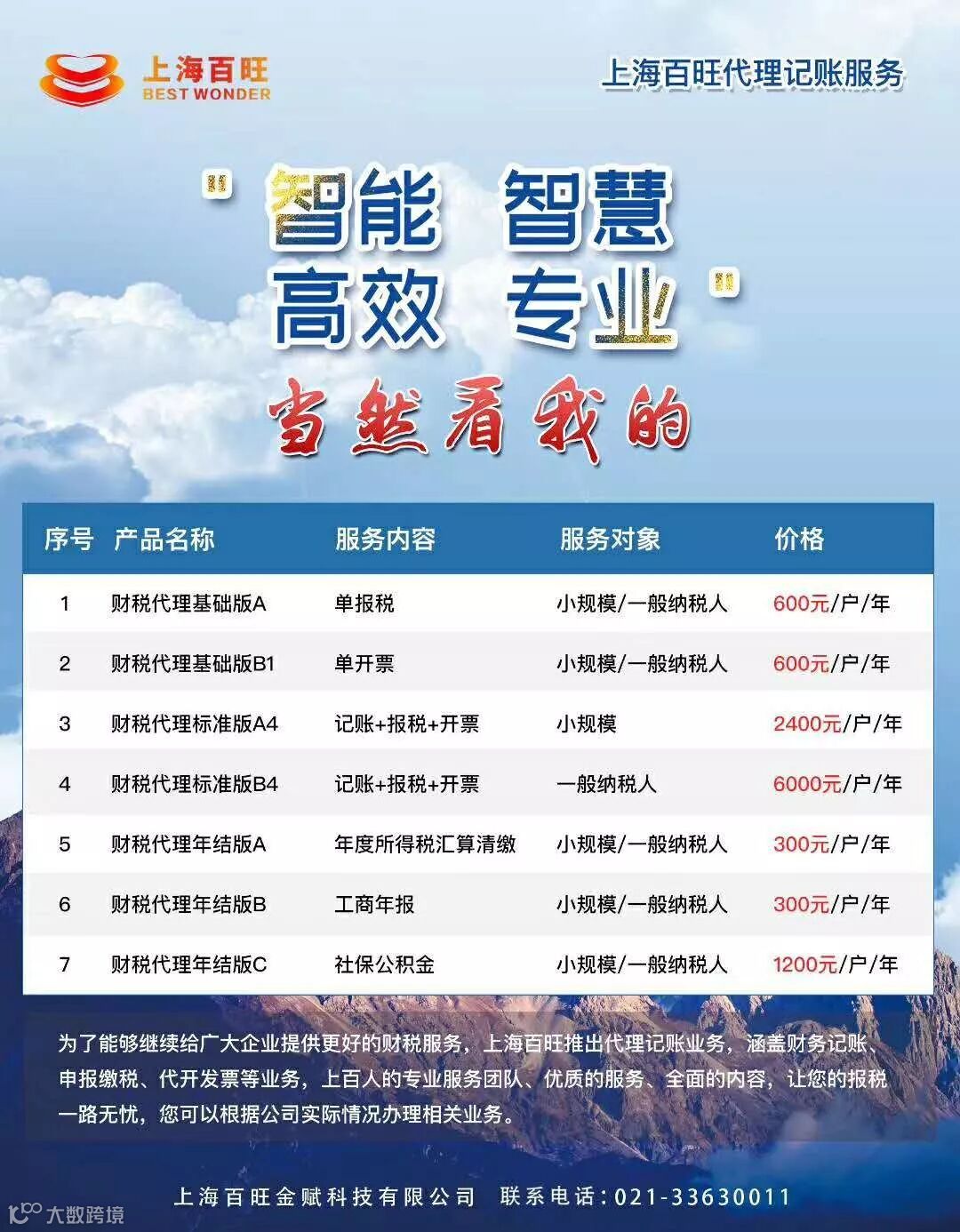上海百旺,提供最优质的代理记账服务。始终秉持“诚信服务,贴心客户”的理念,智能、智慧、高效、专业,做上海财税行业企业服务领航者!欢迎来电咨询!
