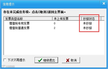 说明还未抄报反写成功,反写成功开票截止日期变更即为抄报成功。退出有此提示,请抓紧时间做抄报反写工作。