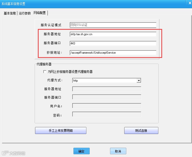 点击系统设置-系统参数设置-参数设置-网络配置-查看服务器地址和端口是否正确(上海服务器地址:skfp.tax.sh.gov.cn 端口号:443)然后测试连接,若提示成功,点击手工上传发票明细,将软件中未上传的发票进行上传,提示为0张之后,再进行网上抄报。