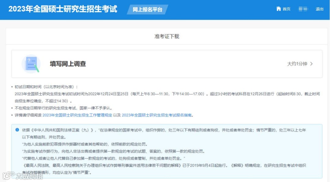 2023研考生,注意了!下载《准考证》功能今日(12月14日)开通,届时研考生凭网报用户名和密码登录“研招网”自行下载打印《准考证》。