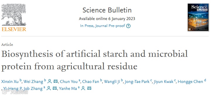 2023年1月6日,中国农业科学院生物技术研究所:Xinxin Xu(第一作者)、Wei Zhang(通讯作者);中国科学院天津工业生物技术研究所:Yi-Heng P. Job Zhang(通讯作者)、Yanhe Ma(通讯作者)等联合在国际顶级期刊 Science Bulletin (Q1,IF: 20.577)发表题为“Biosynthesis of artificial starch and microbial protein from agricultural residue”的研究性论文。