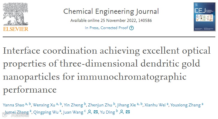 近日,暨南大学理工学院丁郁教授团队在工程技术1区Top期刊Chemical Engineering Journal(Q1,IF=16.744)发表了题为“Interface coordination achieving excellent optical properties of three-dimensional dendritic gold nanoparticles for immunochromatographic performance”研究性文章。本研究的第一作者是邵艳娜博士研究生。
