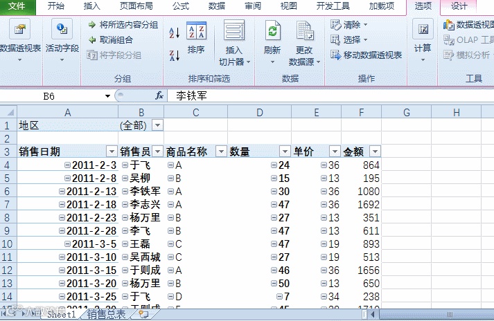 地区添加到筛选标签,其他的全部添加到行标签