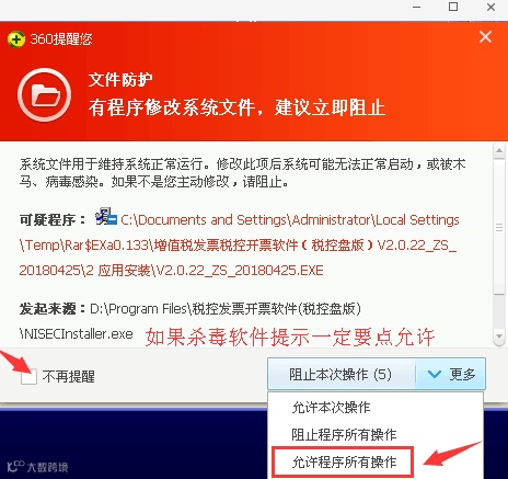 2、在升级过程中由于软件会向电脑系统注册表中写入信息,因此易被杀毒软件拦截,导致安装失败。在安装过程中若出现如下类似提示,请将提示框下方【不再提醒】勾选上并选择【允许程序所有操作】。