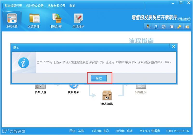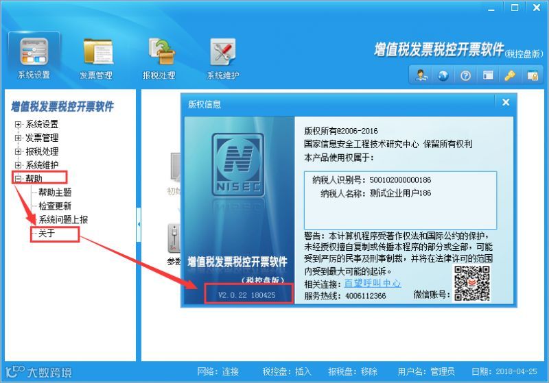 升级完成后,重新登录开票系统,软件自动提示“自2018年5月1日起,纳税人发生增值税应税销售行为,原适用17%和11%税率的,税率分别调整为16%、10%”,点完确定后在帮助-关于中查看版本号为V2.0.22 180425,软件升级完成。