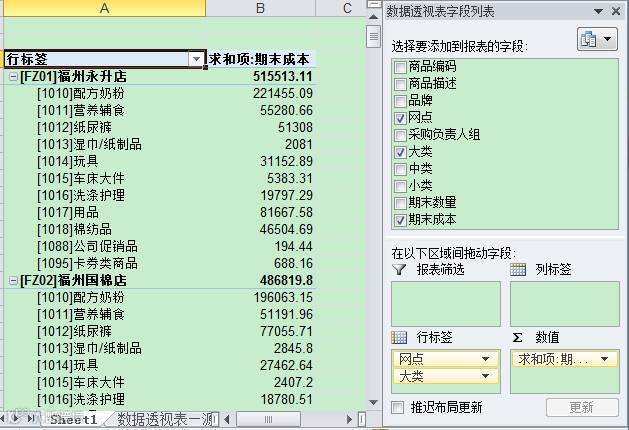 · 将表头[网点]、[大类]依次拖入[行标签]框内,将[期末成本]拖入[数值]框内