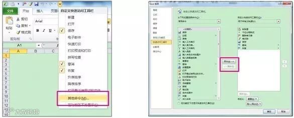 · 点击快速访问栏最右的向下箭头,点击“其他命令”