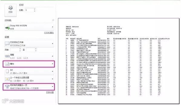 · 在设置中选择“横向”、“将所有列调整为一页”