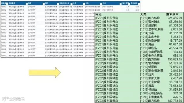 举个栗子,我们将下图中的清单汇总成[门店]、[大类]、[期末成本]三列。