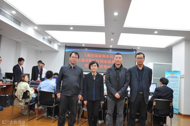 图中从左依次是上海市税务局副局长刘新利、胡兰芳、蒋旭涛,上海百望总经理王勇