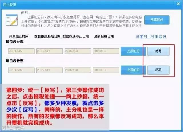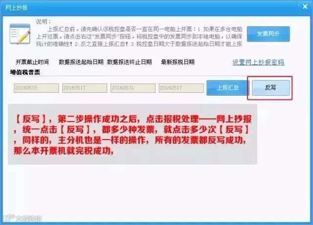 第三步:【反写】,第二步操作成功之后,点击报税处理——网上抄报,统一点击【反写】,都多少种发票,就点击多少次【反写】,同样的,主分机也是一样的操作,所有的发票都反写成功,那么本开票机就完税成功,如下图:
