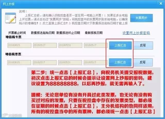 第二步:点击【上报汇总】,向税务机关提交报税数据,初次点击上报汇总的时候会提示让设置网上抄报的密码,建议设置为88888888,以后再抄报,就无需再输入了。
